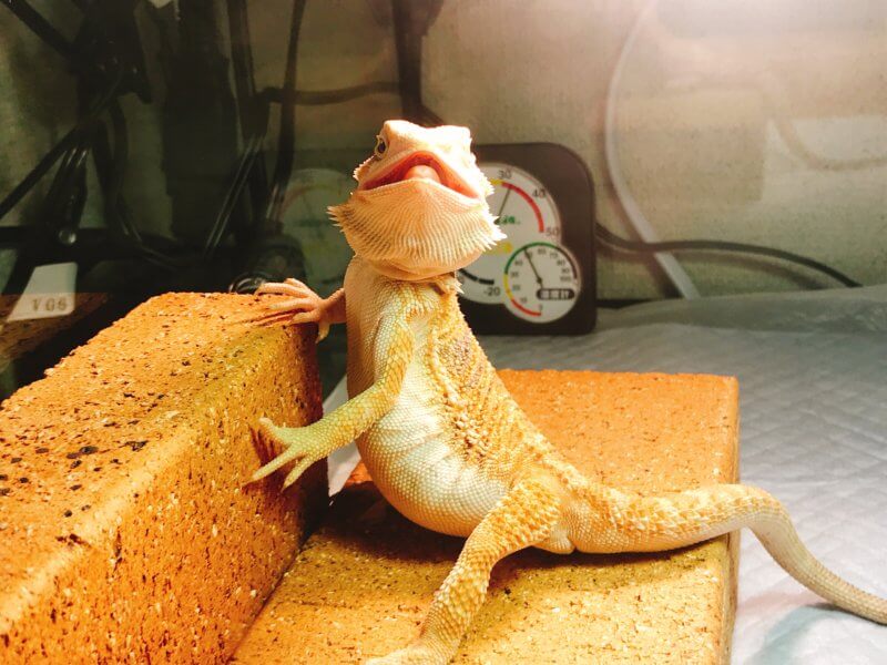 バスキングライトが当たる部分は空気も温度が高く、そこで口を開ければ暖かい空気が肺に入り、体温をあげることが出来るため、口を開けていると言われています。