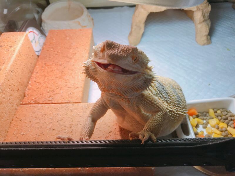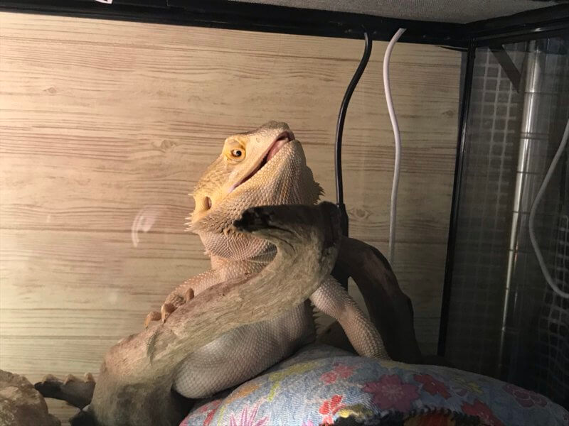 うちのコンちゃんは威嚇することがほとんどなく写真が無いのですが、フトアゴヒゲトカゲは威嚇する時にも大きく口を開けます。特に喉・顎の部分を黒くして顔を膨らませながら口を開けている場合は威嚇しているので、そっとしておいてあげましょう。